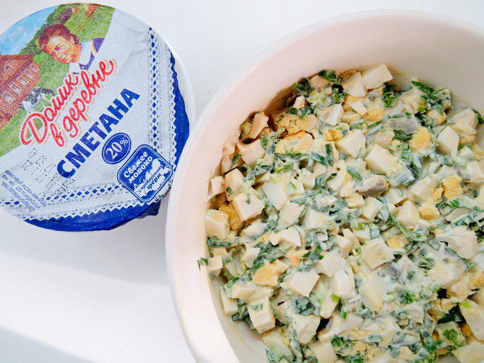 Перемешиваем все ингредиенты, солим, перчим и заправляем сметаной «Домик в деревне» 20%.