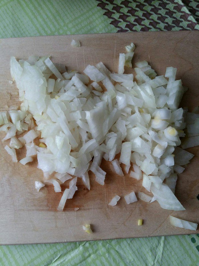 Для начала берем репчатый лук и измельчаем на мелкие кусочки.