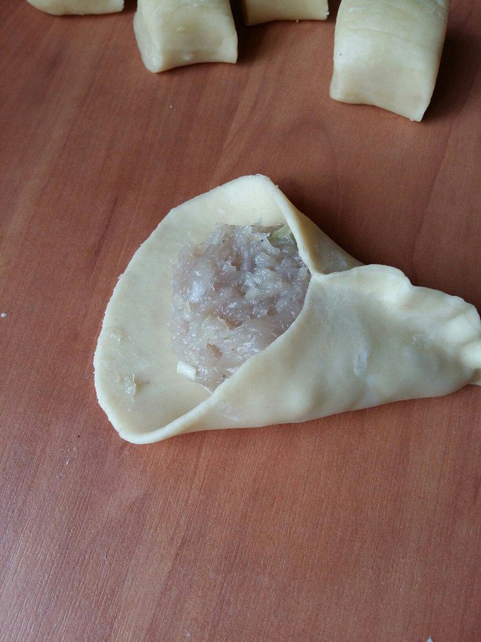 Начинаем лепить самбусу. Поднимаем два края, скрепляем их между собой.