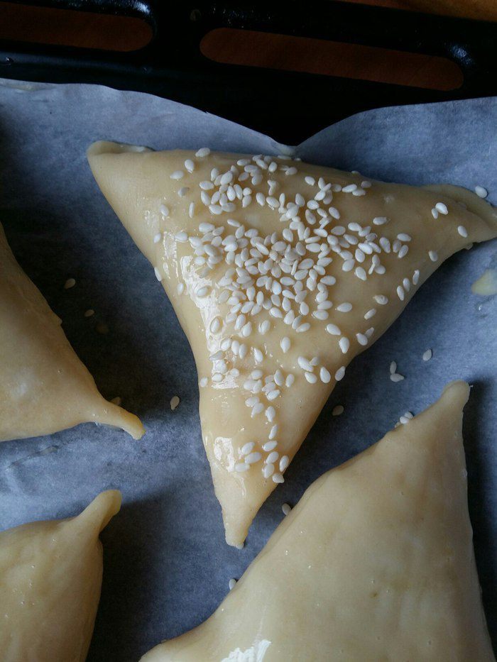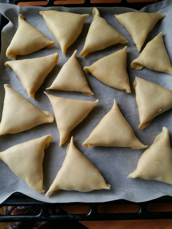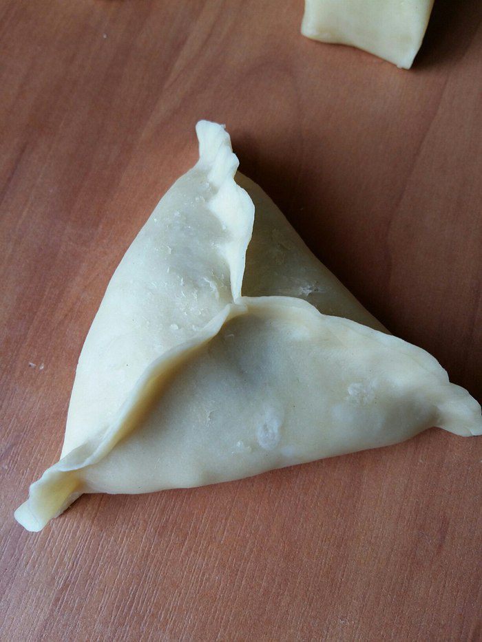 Поднимаем третий край, скрепляем все три края вместе. Придавим уголки. Перевернем швом вниз, получается треугольник. Затем тоже самое повторяем для остального теста.