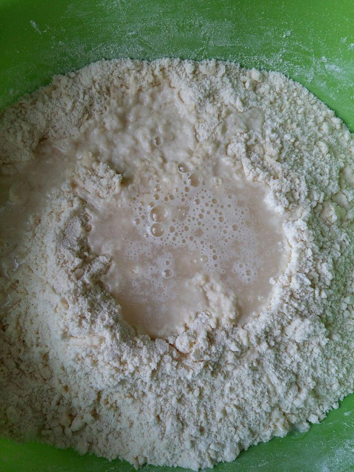 Делаем в середине углубление и вливаем холодную воду. Все перемешиваем.