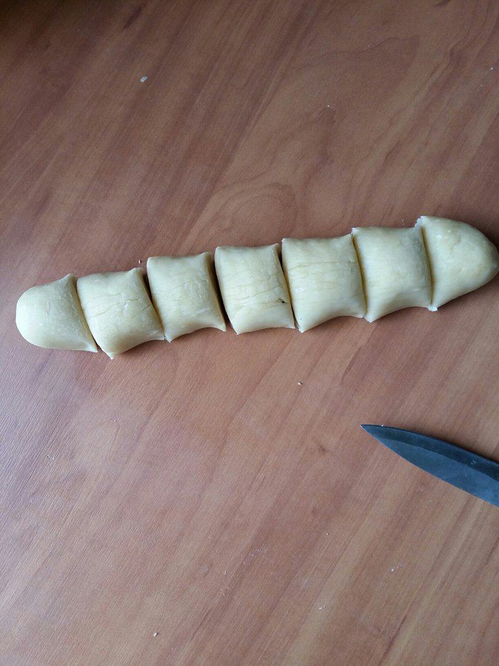 Достаем наше тесто. Делим на 2 части, вторую убираем в холодильник. Раскатаем тонкую колбаску. Делим на 7 частей.