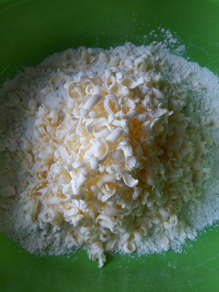 Натираем на крупной терке сливочное масло из холодильника. Руками перетираем масло с мукой в крошку.