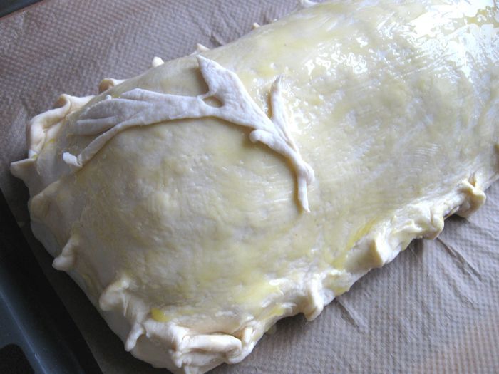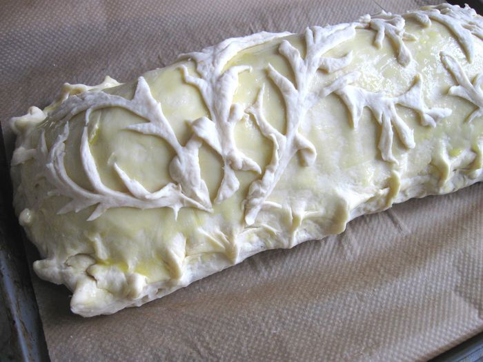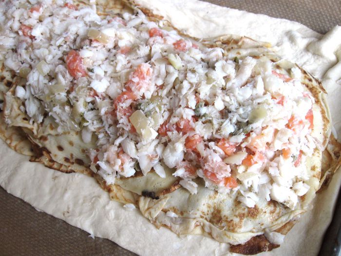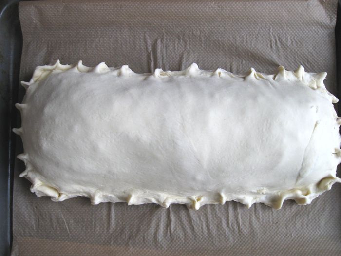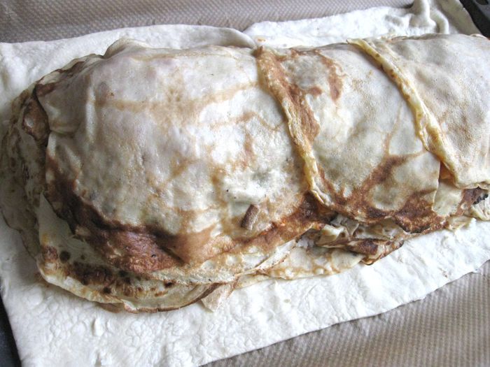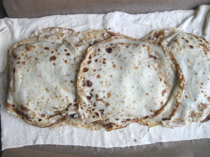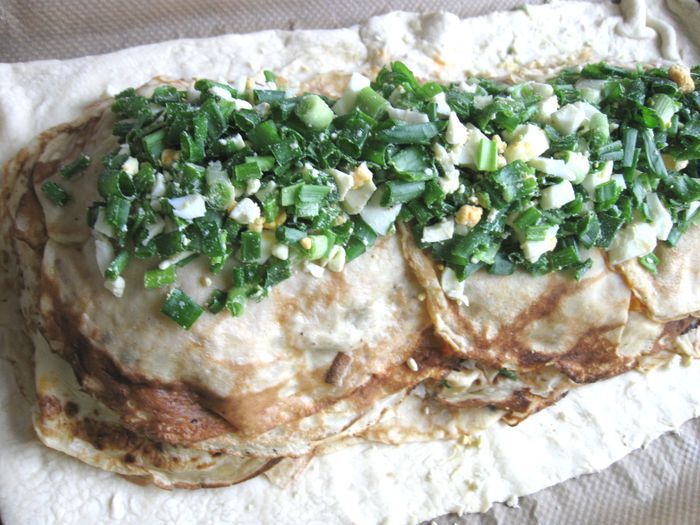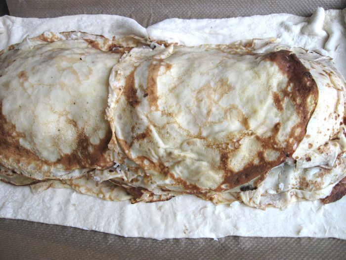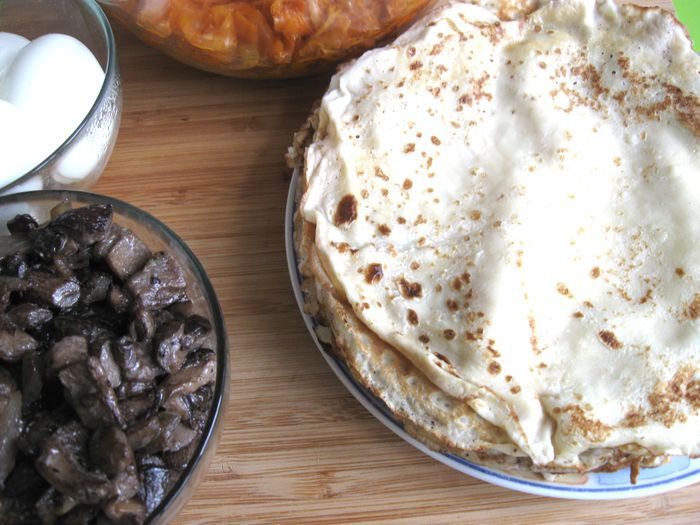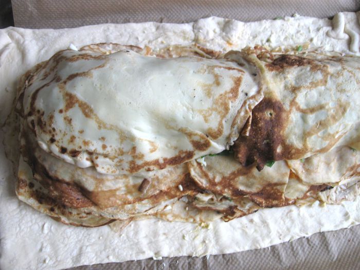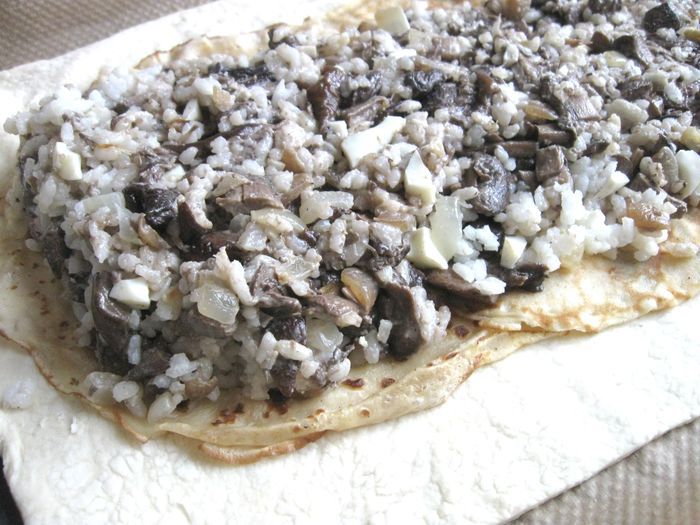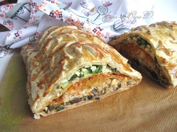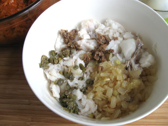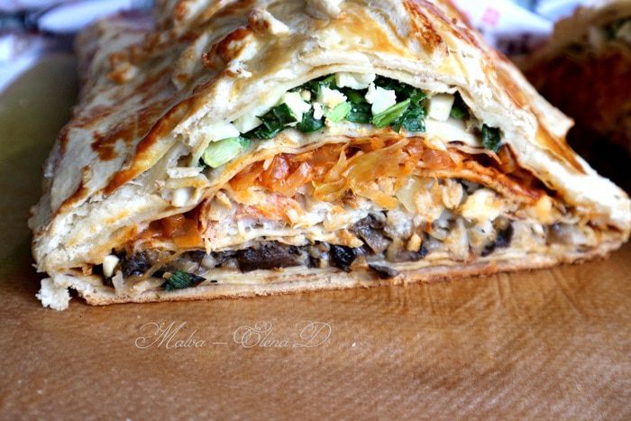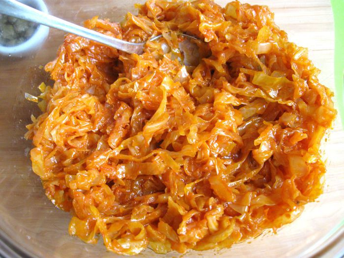 Капусту порезать. Лук почистить, порезать, обжарить на сковороде, добавить томатную пасту, обжарить 1 минуту, добавить капусту, обжарить до готовности (посолить, добавить сахар, лимонный сок, в конце — щепотку тмина). В процессе приготовления добавить сливочное масло и 2 — 3 ст. л. воды. Протушить, начинка не должна быть жидкой, а сочной и мягкой.
