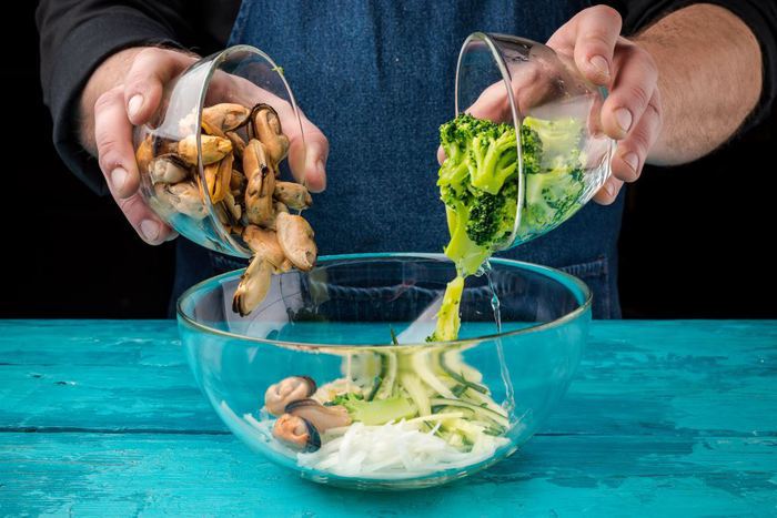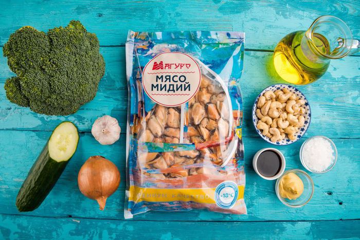 В салатнике смешать брокколи, огурцы, лук, чеснок и мидии.