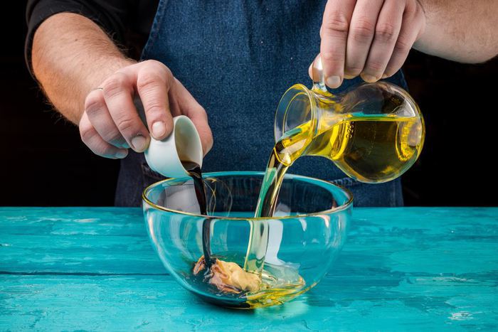 Для заправки смешать оливковое масло, горчицу и соевый соус.