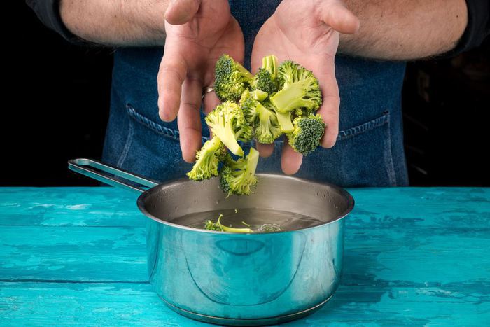 Брокколи вымыть, разобрать на соцветия и отварить в кипящей подсоленной воде 8 минут.