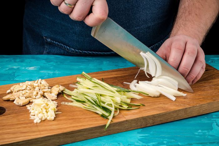 Огурцы нарезать тонкой соломкой. Лук и чеснок очистить и измельчить. Орехи очистить и перемолоть в блендере.