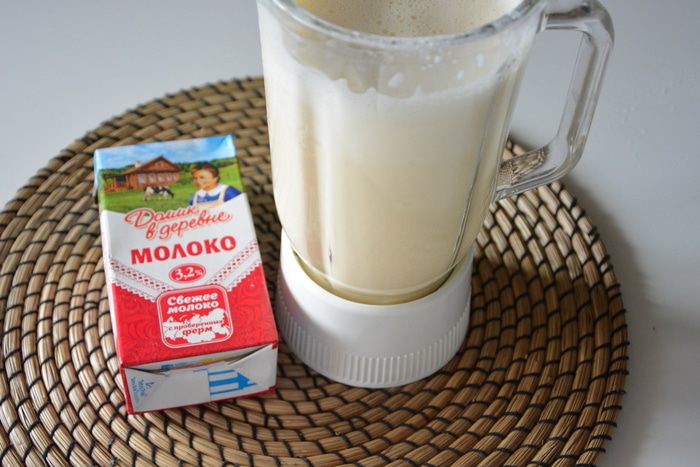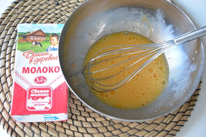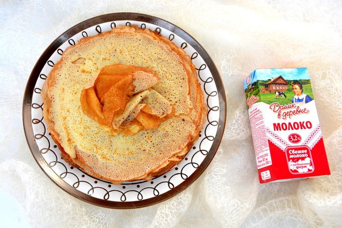 Добавить теплое молоко, растительное масло, просеянную муку, крахмал, соль. Муку и крахмал берем по ст. л. с горкой: сперва 4 ст. л. Взбить блендером. Тесто должно быть очень жидким, как жидкая сметана. Испечь 1 блин. Если блины рвутся при переворачивании, то нужно добавить немного муки. Качество муки и размер яиц у всех разные, поэтому вам может понадобиться больше или меньше муки и/или крахмала.