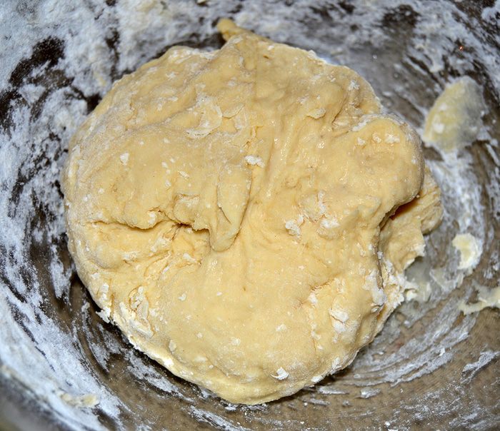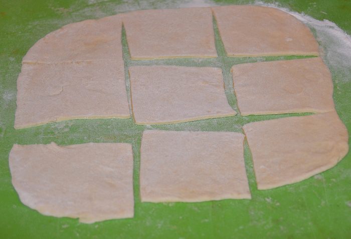 Тесто раскатать пластом толщиной 0,5 см и нарезать на квадраты стороной примерно 8 см.