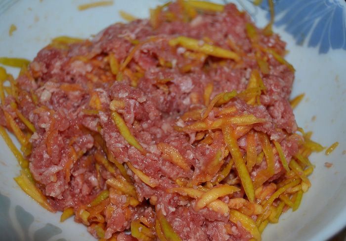Говядину пропустить через мясорубку, тыкву натереть на терке, смешать их, посолить-поперчить по вкусу. По желанию можно добавить свежую зелень и любимые специи.