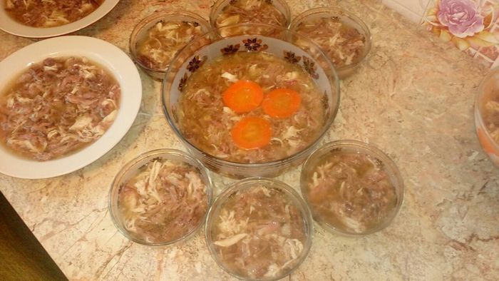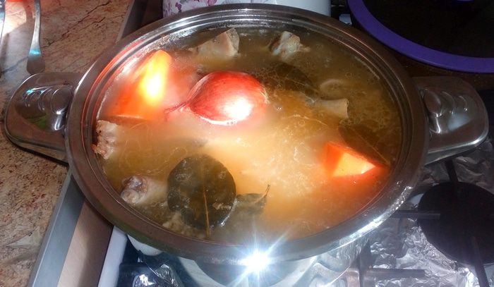 После того, как наш будущий вкусный холодец поварится 5 часов, добавить в него соль, лавровый лист, целую очищенную морковь и луковицу. Раньше добавлять овощи нет смысла — весь их аромат улетучится в процессе варки. Кстати, луковицу не очищайте от наружной шелухи, а просто хорошенько промойте — это придаст готовому бульону приятный золотистый цвет.