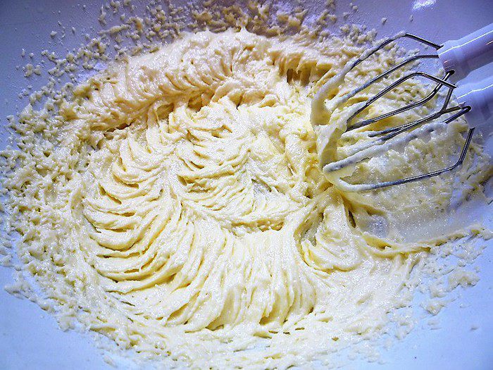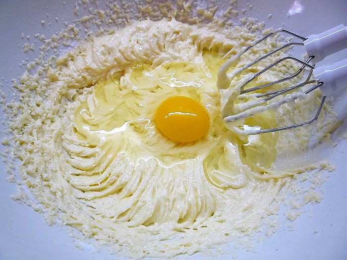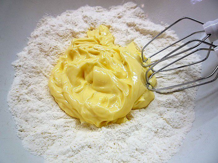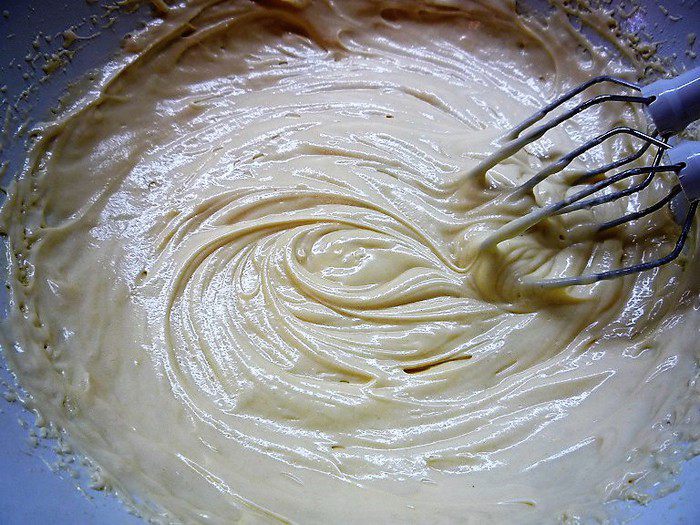 Продолжя взбивать, добавляем по одному яйца. Затем добавляем муку и еще раз хорошо взбиваем.