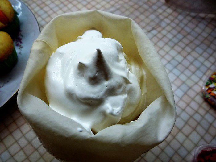 Для украшения взбиваем сливки и украшаем капкейки с помощью кондитерского мешка с насадкой «звездочка».