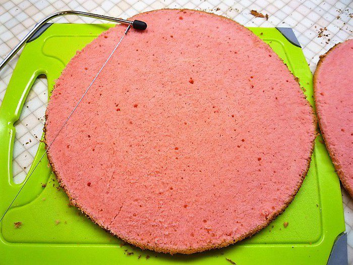 Готовый корж остужаем и разрезаем вдоль пополам.