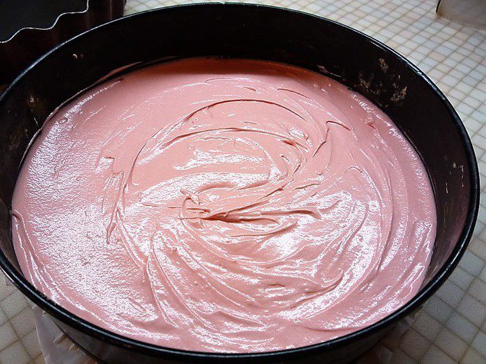 Вмешиваем краситель в тесто, выкладываем тесто в форму, застеленную бумагой для выпечки, и выпекаем в заранее разогретой духовке при температуре 180°С в течение 20 минут.