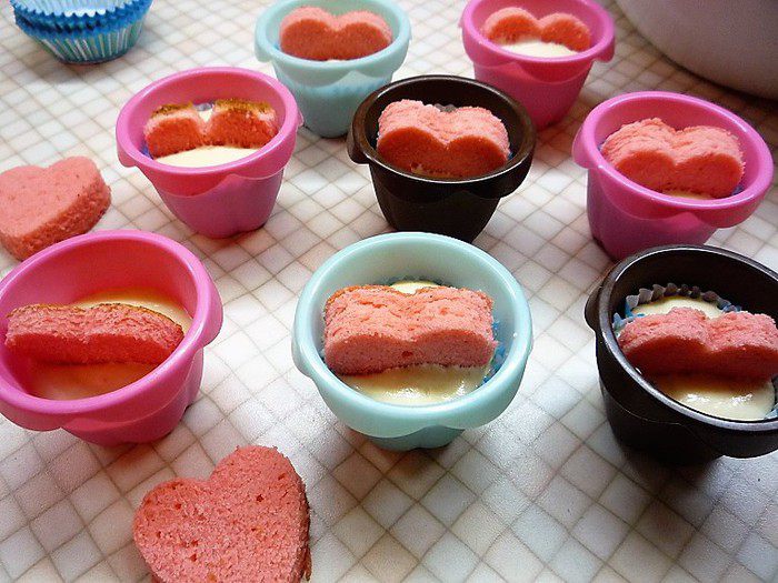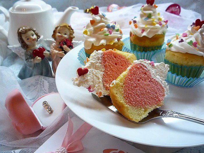В формы для кексов кладем бумажные формочки, выкладываем в каждую 2/3 теста и аккуратно вставляем сердечки. Выпекаем капкейки в заранее разогретой духовке при температуре 180°С в течение 15 — 20 минут.
