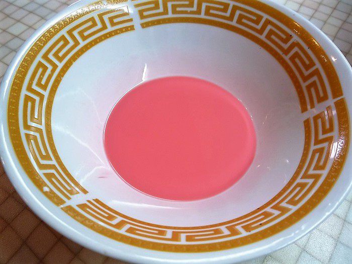 В небольшую пиалу наливаем молоко, добавляем ванильный экстракт и несколько капель красного пищевого красителя (я использую краситель-гель).