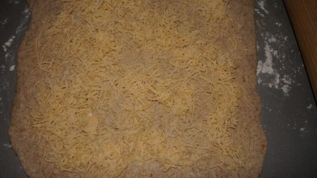 Тесто обмять. Стол присыпать мукой и раскатать тесто в пласт. Присыпать тертым сыром и измельченным чесноком.