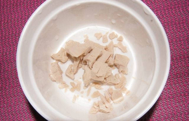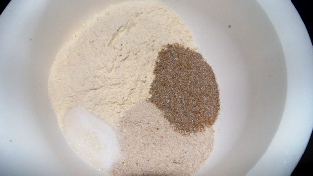 Смешать оба вида муки, отруби, сахар и соль. Добавить оставшиеся 200 мл теплой воды и дрожжи.