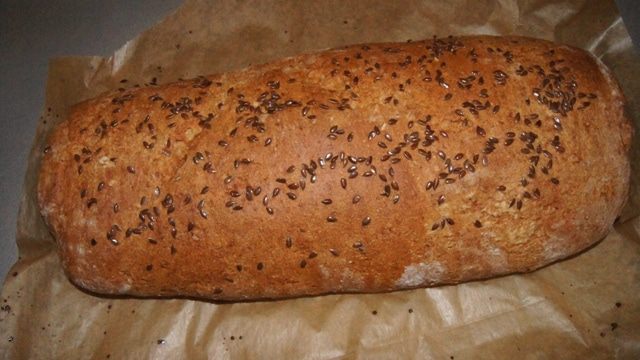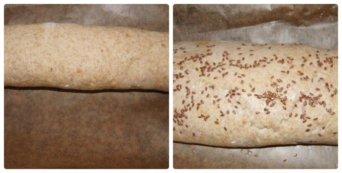 Свернуть плотно тесто в рулет, поместить в форму или просто на бумагу для выпечки и дать подняться около 40 минут. Смазать молоком и присыпать льняными семечками.