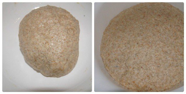 Замесить тесто. Сначала месим ложкой, потом 5 минут руками. Миску смазать маслом, обвалять в масле шар теста и оставить расстаиваться на 1 час в теплое место без сквозняков.