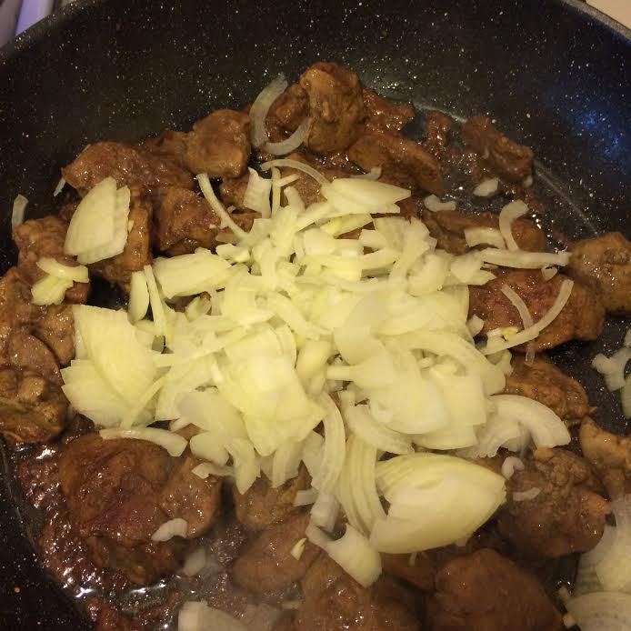 К готовой печени добавить лук, накрыть крышкой и тушить 2 — 3 минуты.