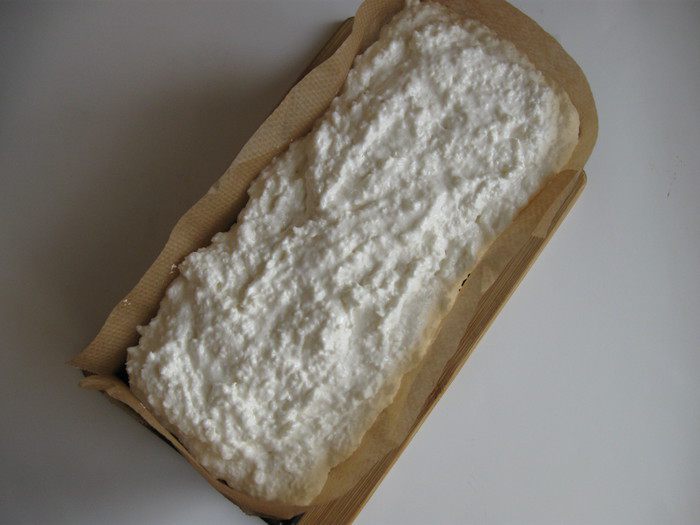 Достать маковый пирог из духовки и разрезать поверхность пирога вдоль на 3 см в глубину. Консистенция его будет несколько нестабильная. Разрез должен делаться с отступлением от краев на пару сантиметров. Вставить по периметру дополнительные бортики из пекарской бумаги для кокосового покрытия.