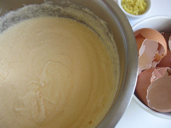 Затем — яйца (по одному, взбивая после каждого яйца смесь), цедру лимона.
