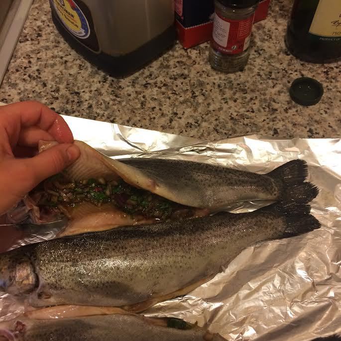 Наполнить брюшко форели начинкой.