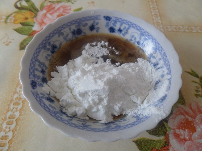 В чашку разбиваем яйцо, добавляем 1 ст. л. соевого соуса и 1 ст. л. крахмала. Взбиваем. Тесто для блинчиков готово.