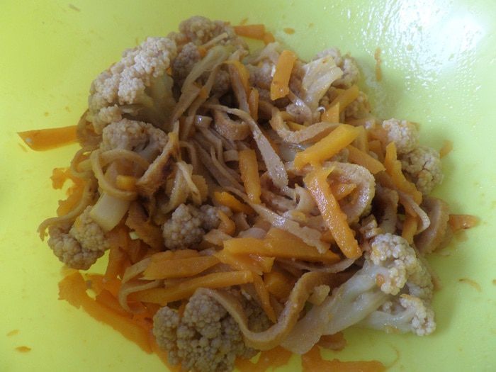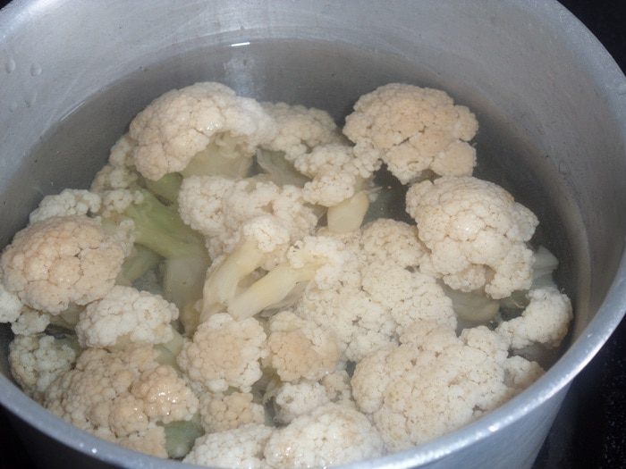 Цветную капусту разбираем на соцветия и отвариваем 5 минут в подсоленной кипящей воде. Откидываем на дуршлаг и обдаем холодной водой.