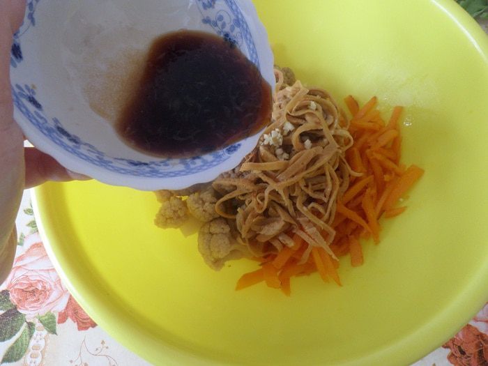 В чашку выжимаем лимонный сок, добавляем сахар, соевый соус и соус табаско (2 — 3 капли по желанию). Добавляем заправку к овощам и блинчикам.