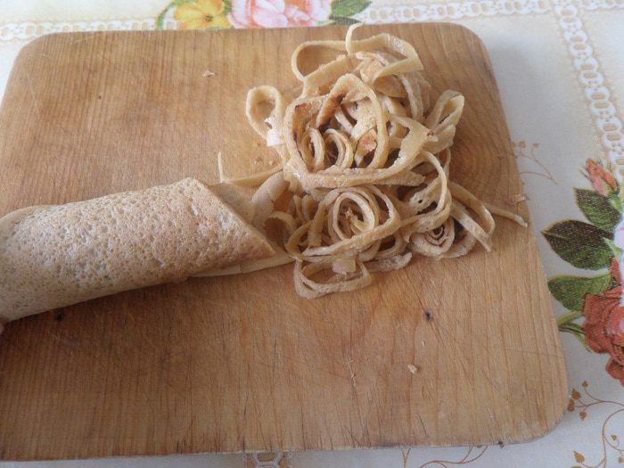 Печем яичные блинчики. Остужаем. Нарезаем «лапшой».