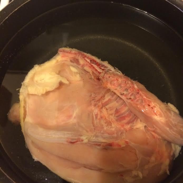 В этот раз я готовила полпорции (из половины курицы). Курицу вымыть, залить водой и отварить до полуготовности (30 — 40 мин.).