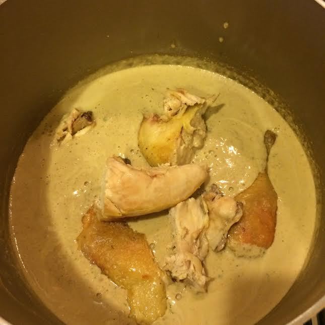 Затем — курицу, аккуратно перемешиваем, даем постоять на медленном огне 5 — 6 минут и снимаем с огня.
