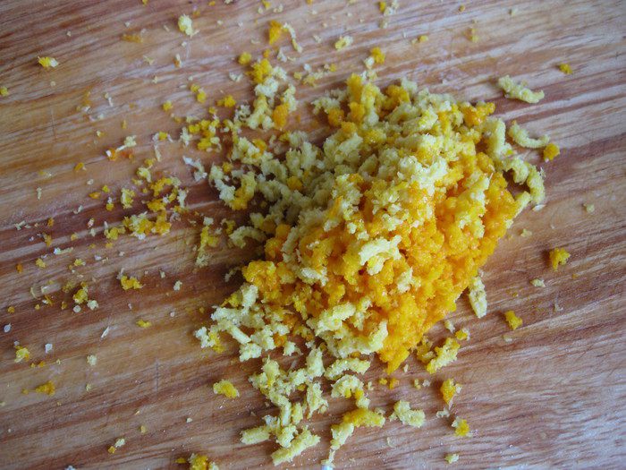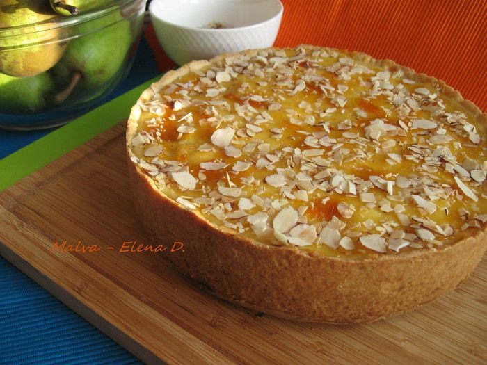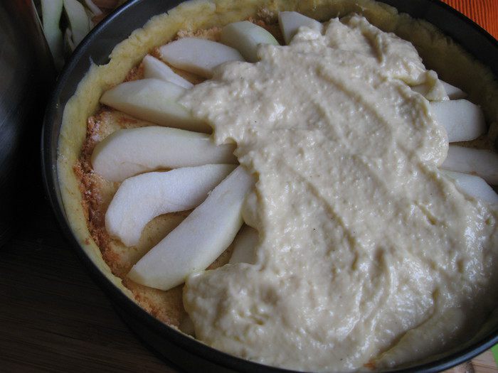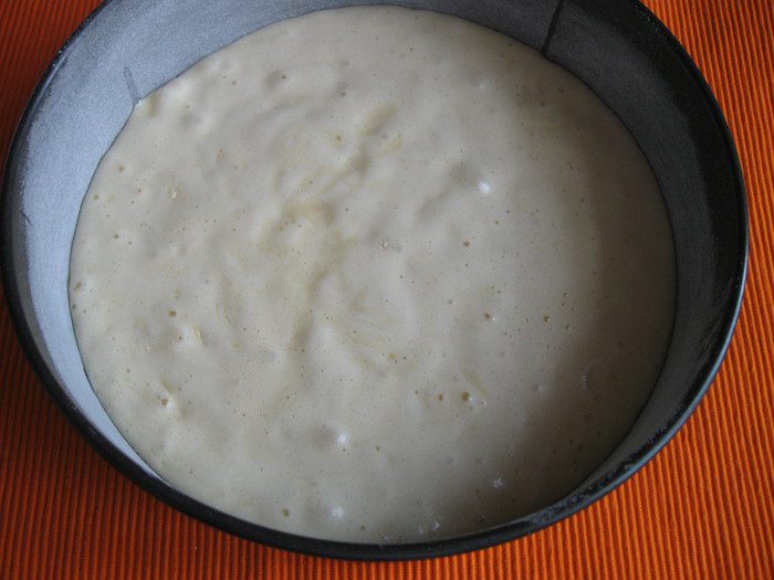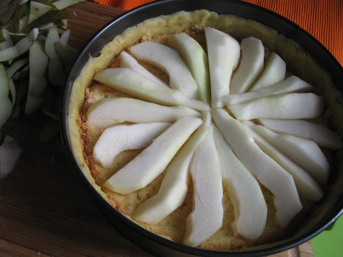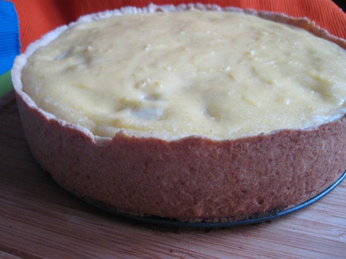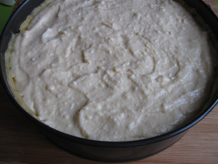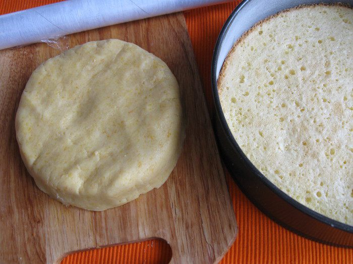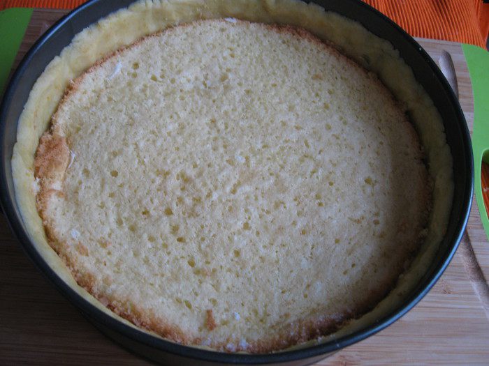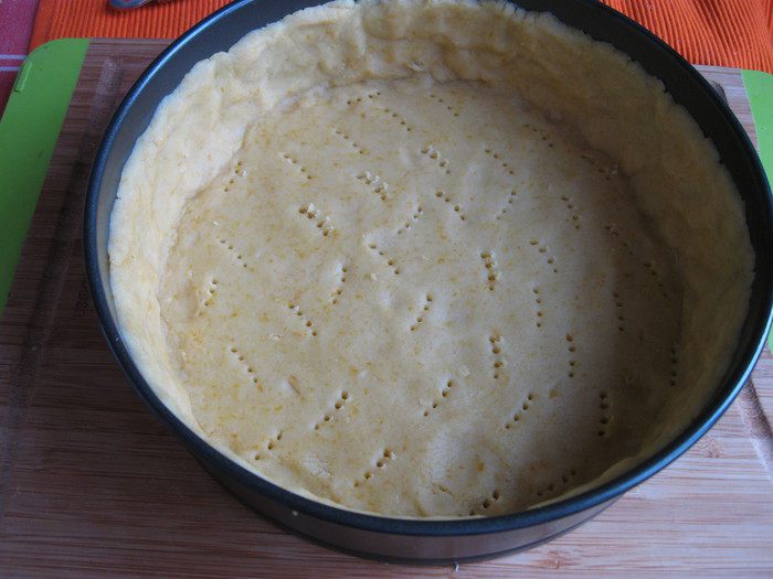 Песочное тесто раскатать на рабочей поверхности, накрытой кружком пекарской бумаги размером с донышко формы. Подставить под тесто и бумагу донышко формы и перенести вместе с донышком к бортикам формы. Закрыть бортики, сформировав ровные борта из теста, бортики из теста должны быть максимально высокие. Наколоть тесто вилкой, убрать форму на 5 — 10 минут в холодильник.
