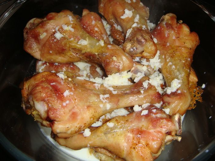 Полить молочно-чесночным соусом и поставить в духовку на 5 минут. Блюдо подавать горячим с картофельным пюре. Приятного аппетита!