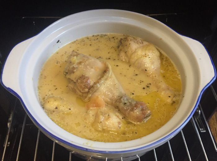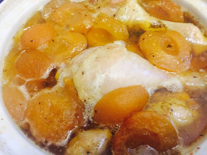Приготовить соус на той же сковороде, где обжаривали курицу. Для этого обжариваем лук до золотистой корочки, затем добавить помидор без кожи, базилик и соль и обжариваем еще минут 5. Затем добавить сироп от абрикосов и мед (сироп кисловат у меня был, поэтому я добавила мед, но если у вас сироп и так сладкий, то сел будет лишний) провариваем минуты 2. Далее все измельчаем на блендере до однородной массы. Поставить в заранее разогретую духовку на полчаса на 200°С.