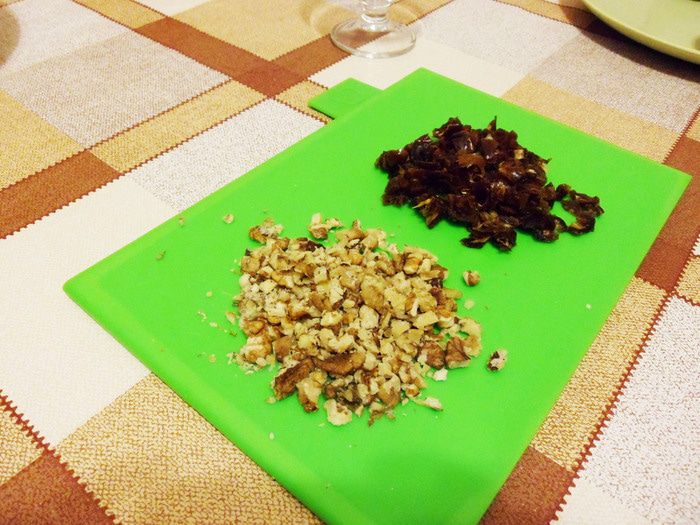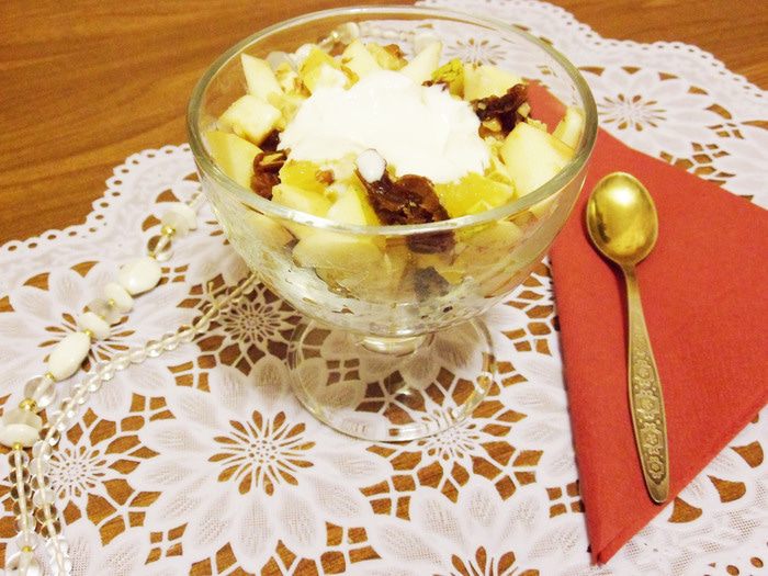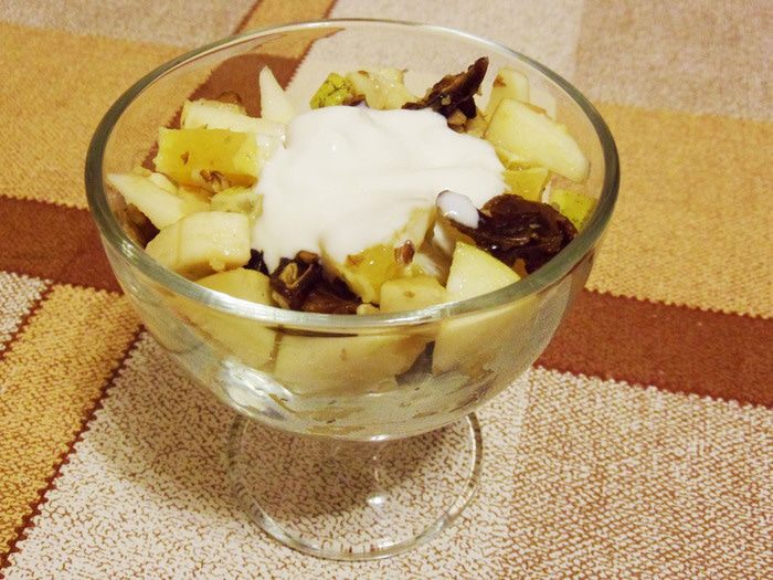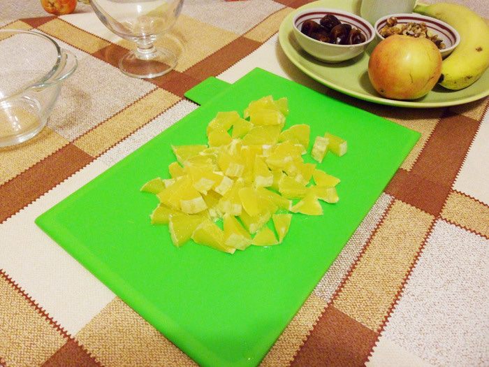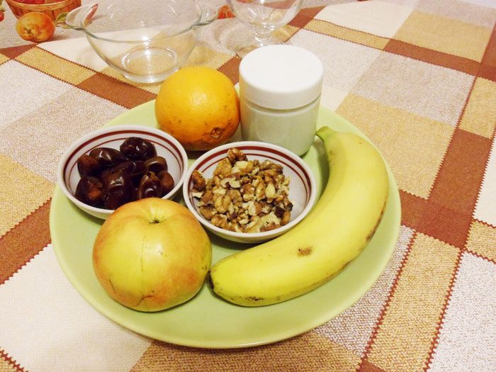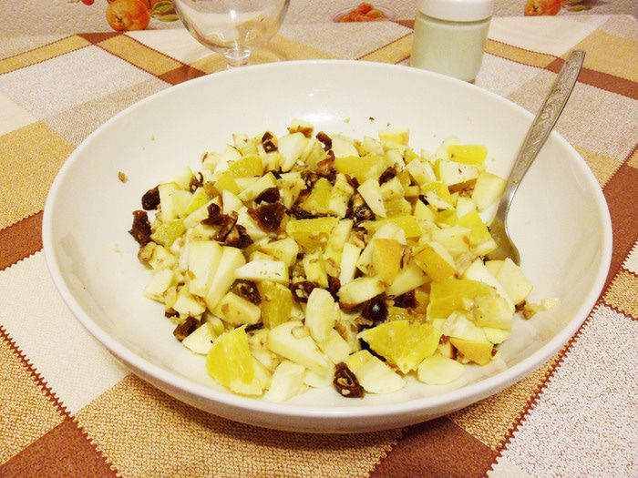 Это мой любимый фруктовый салат. Сочный апельсин, кисло-сладкое яблоко, ароматный банан, сладкие финики, маслянистые орехи — вместе составляют очень вкусный фруктовый салат. А заправка — натуральный йогурт от «Углече Поле»! Этот салат хорош тем, что готовить его можно практически в любое время года, в отличие от летних фруктовых салатов из сезонных фруктов. Итак, сочный сладкий салат из фруктов с орехами и финиками.