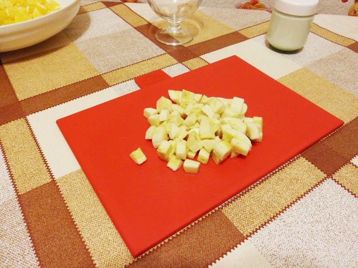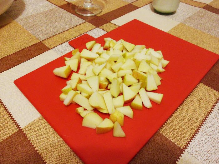 Яблоко нарезать кубиками. Чтобы яблоко не потемнело, протирайте нож ломтиком лимона.