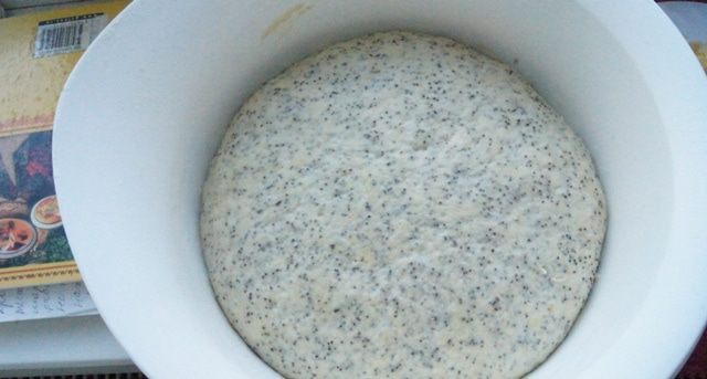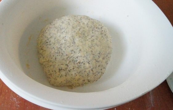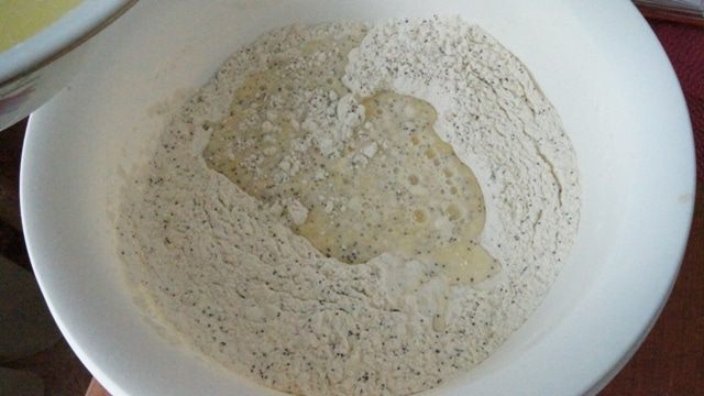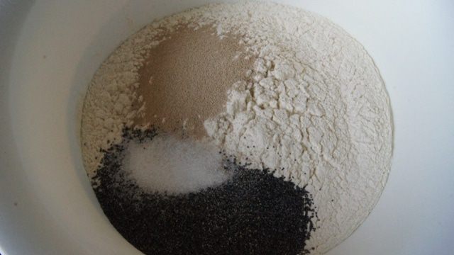 В большой миске смешать сухие ингредиенты: просеянную муку, сахар, соль, мак, дрожжи.