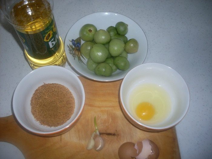 Нарезать помидоры дольками. Окунуть их в яйцо, затем — в панировочные сухари.