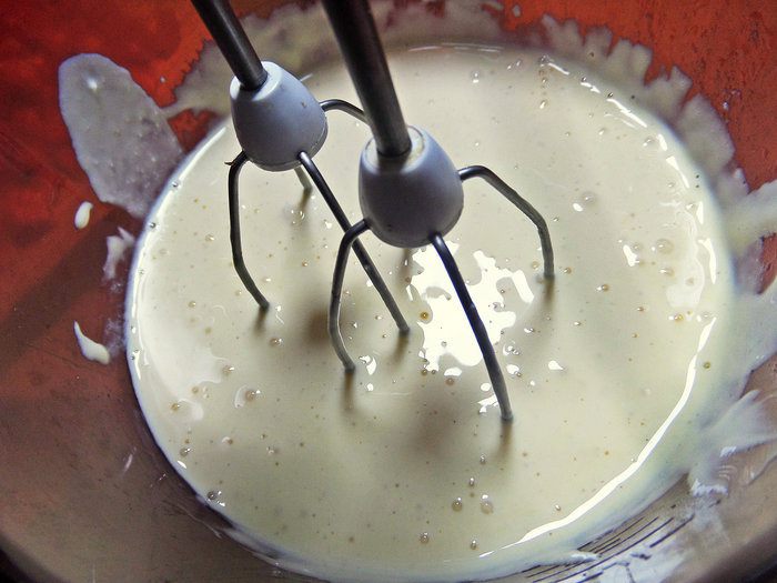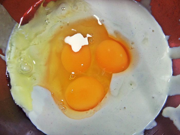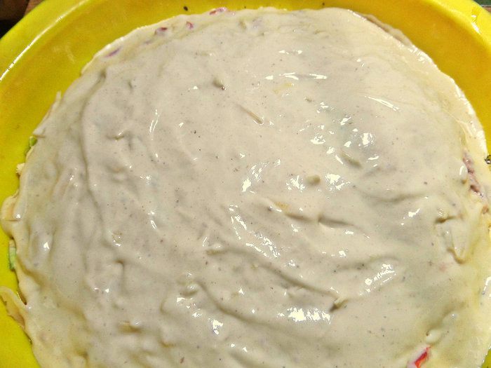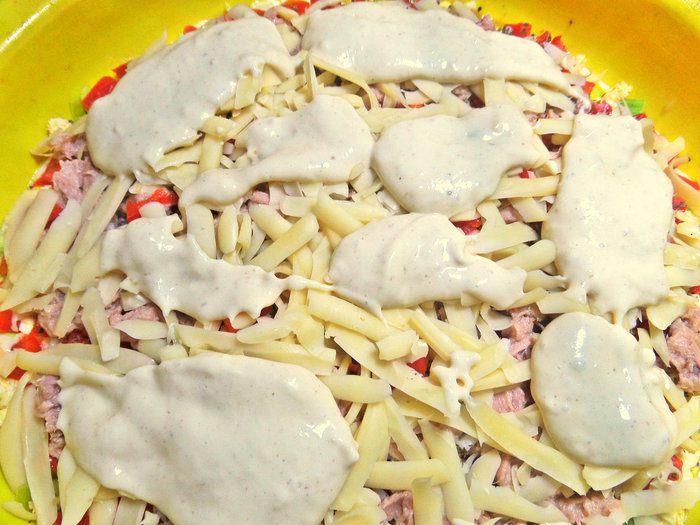 Для теста смешать пополам майонез и сметану. Можно больше сметаны и меньше майонеза или наоборот. Солим, если требуется, тут много зависит от майонеза.