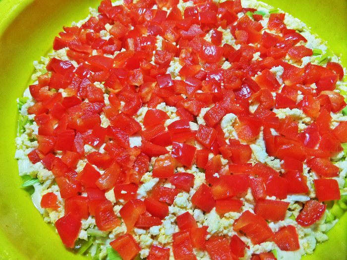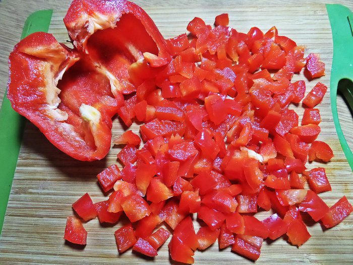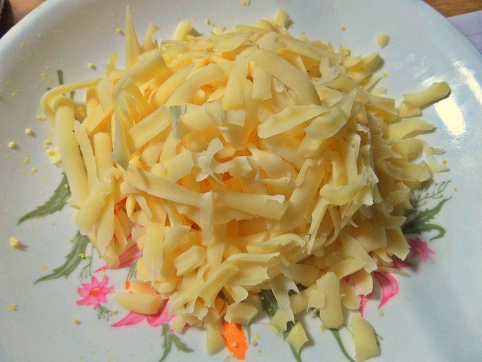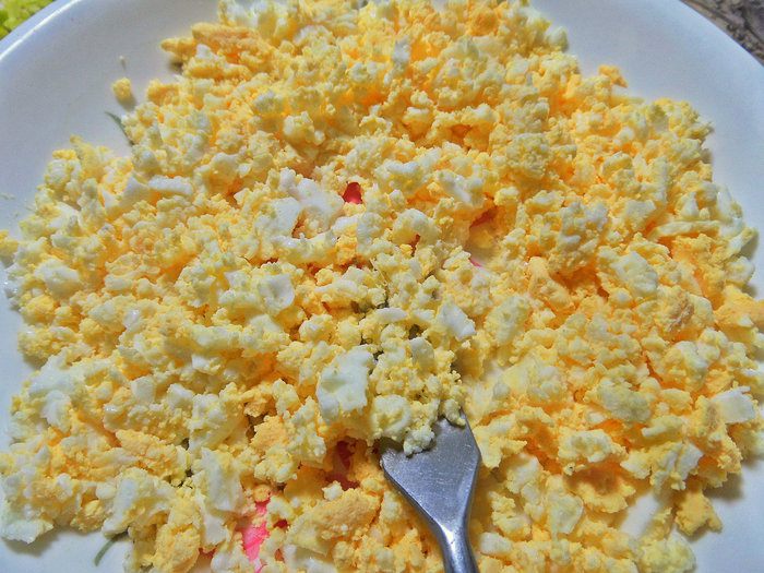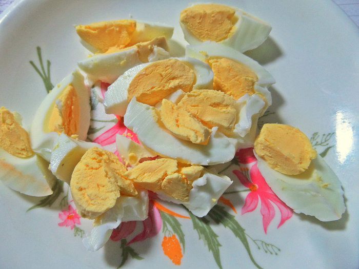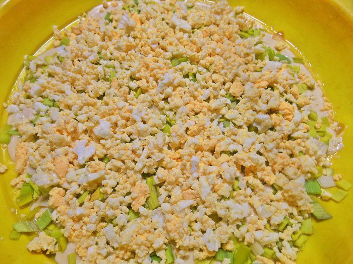 Начнем с подготовки начинки. Яйца отварить, очистить, нарезать крупно пока.