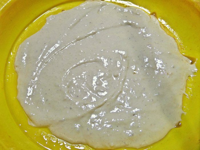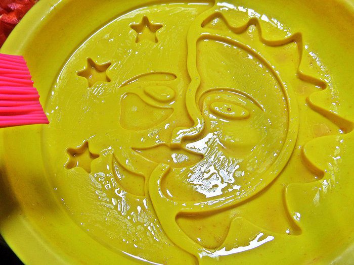 Силиконовую форму можно не смазывать, но в моей много глубоких и мелких деталей, поэтому прошлась кисточкой с маслом для надежности.