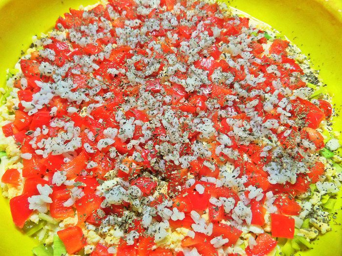 Так как форма широкая (дно 25 см, к верху расширяется 27 см), пирог вышел не высокий, всего 3 см, зато его удобно держать и кушать, прям как пиццу.