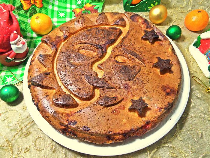 Накрываем большой плоской тарелкой и переворачиваем пирог рисунком вверх.