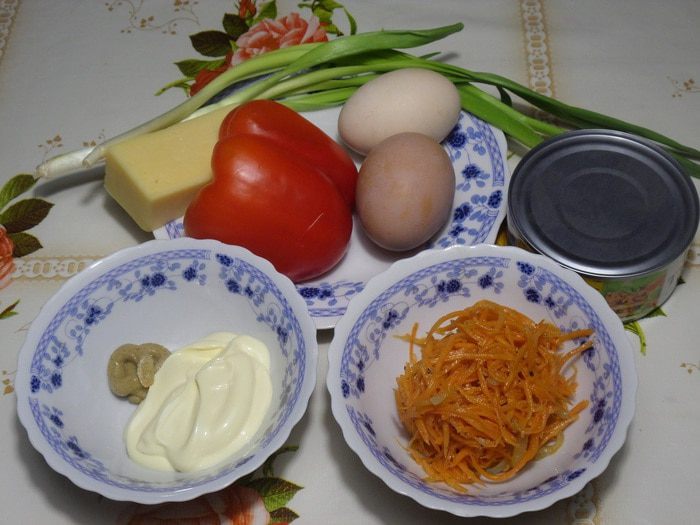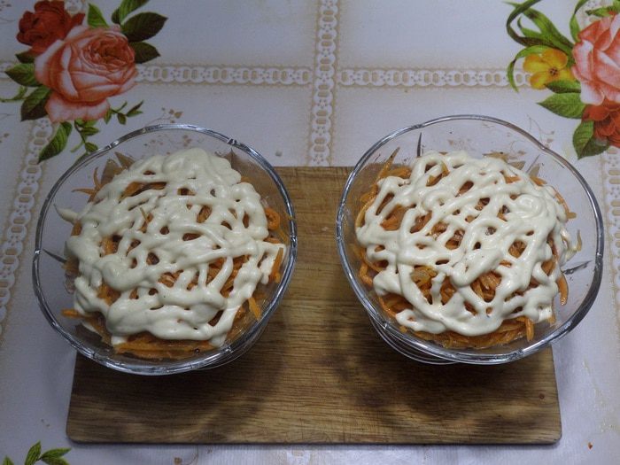 Выкладываем морковь по-корейски. Добавляем соус-заправку.