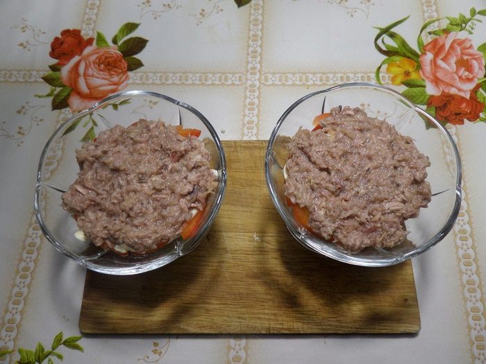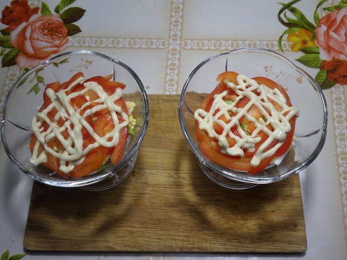 Выкладываем нарезанный болгарский перец. Добавляем соус-заправку.